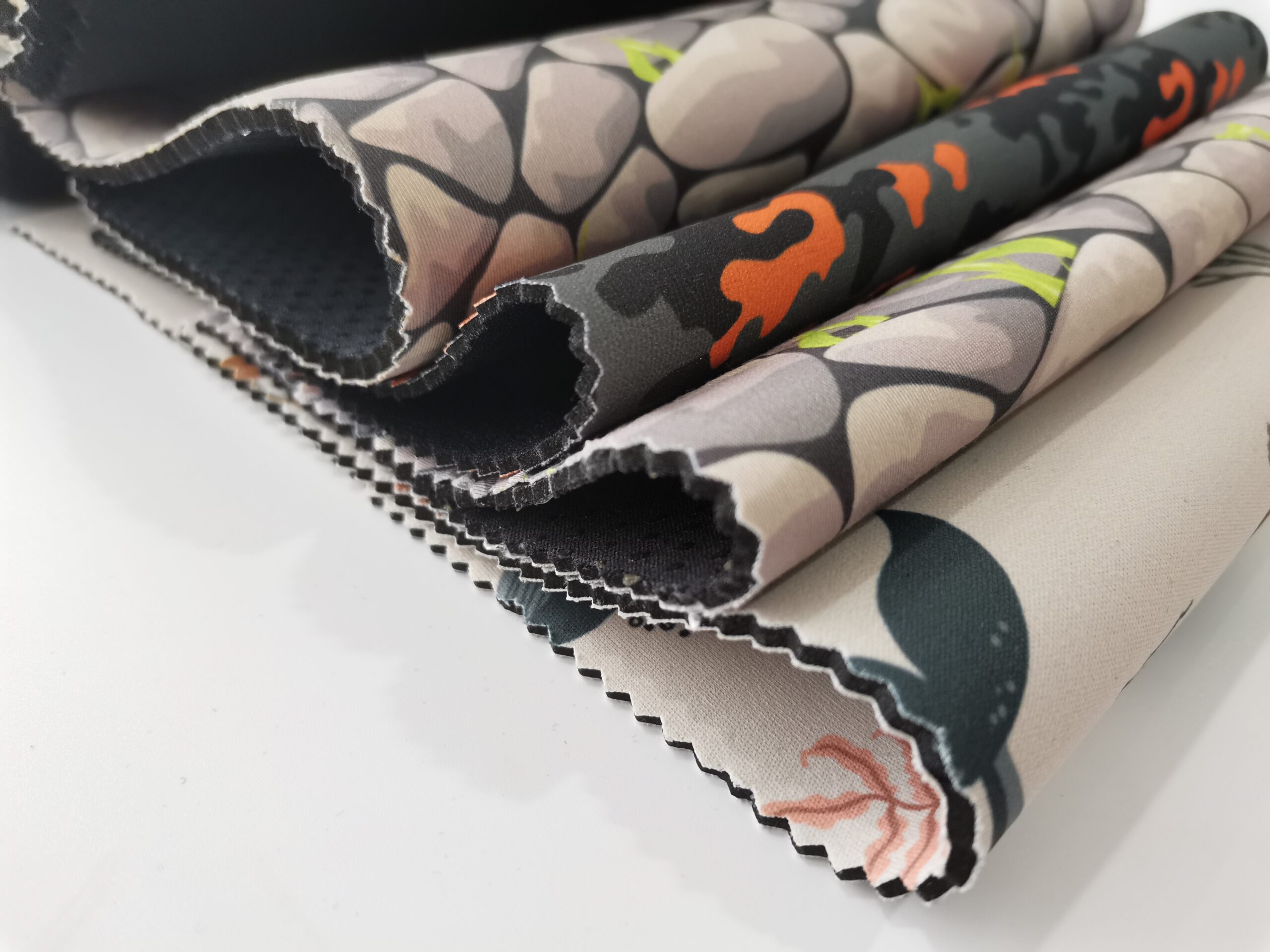 Neoprene rubber laminated with fabric materials can be customized in over 100 colors and Pantone colors, with thickness options from 1-40mm, and is available in screen printing, sublimation printing, embroidery, and other techniques.